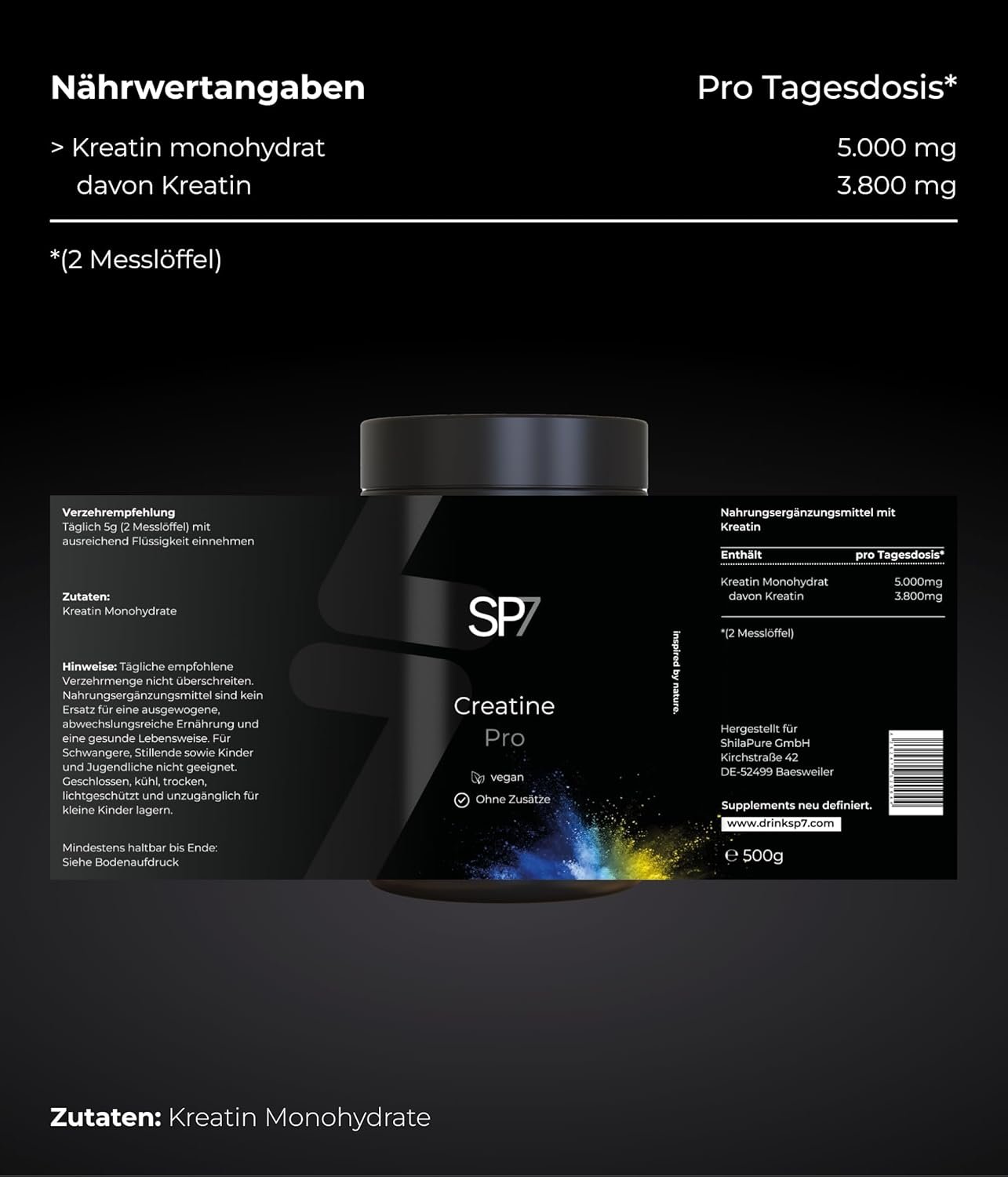 • Mikronisierte Qualität für Bessere Bioverfügbarkeit: Die mikronisierte Form des SP7Creatin Monohydrats sorgt für eine feinere Pulverkonsistenz, die nicht nur leichter löslich ist, sondern auch vom Körper schneller absorbiert wird. Dies garantiert eine effizientere Nutzung und eine maximale Aufnahme, was zu besseren Ergebnissen führt.